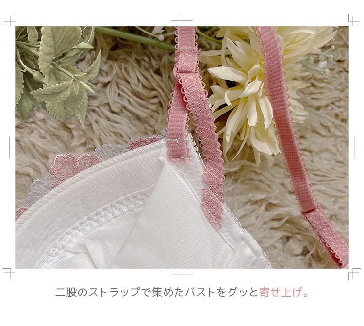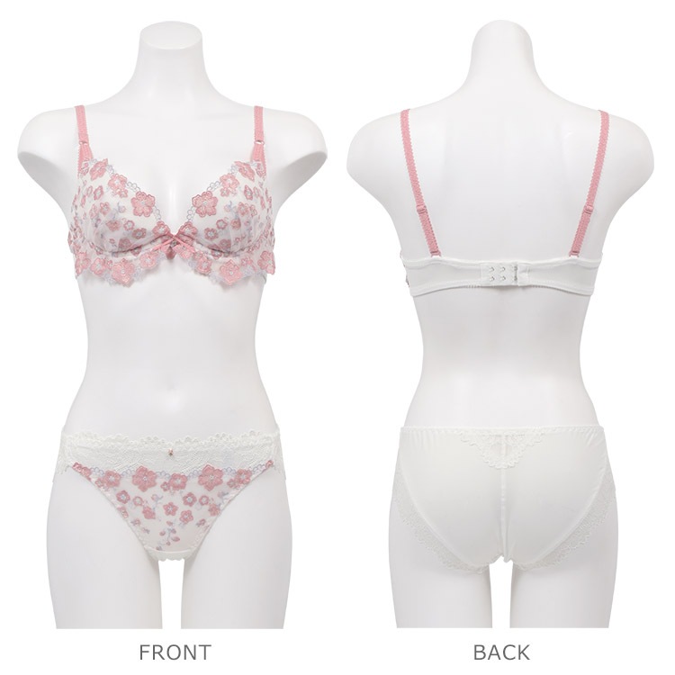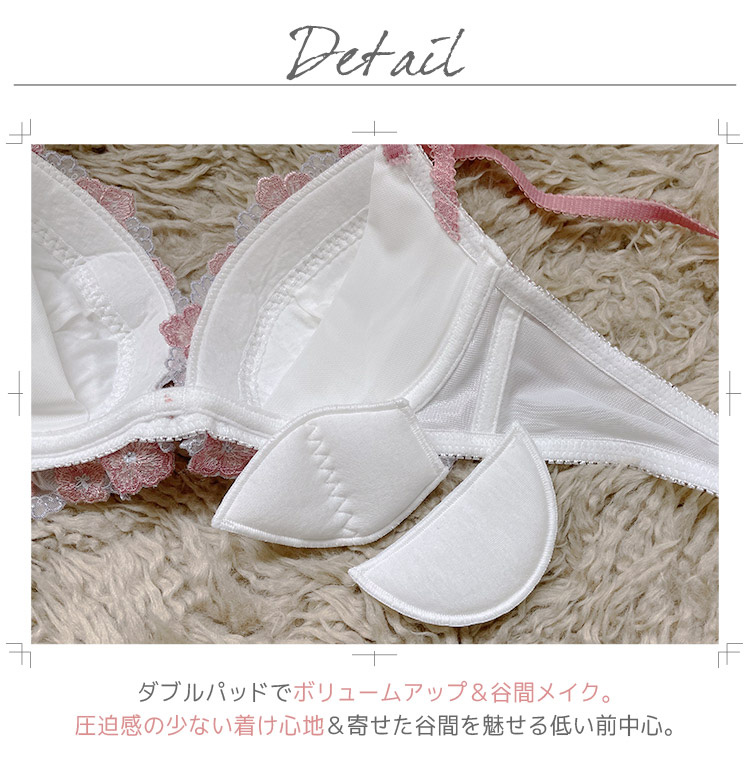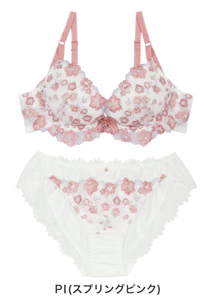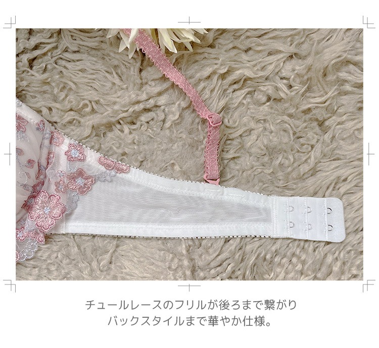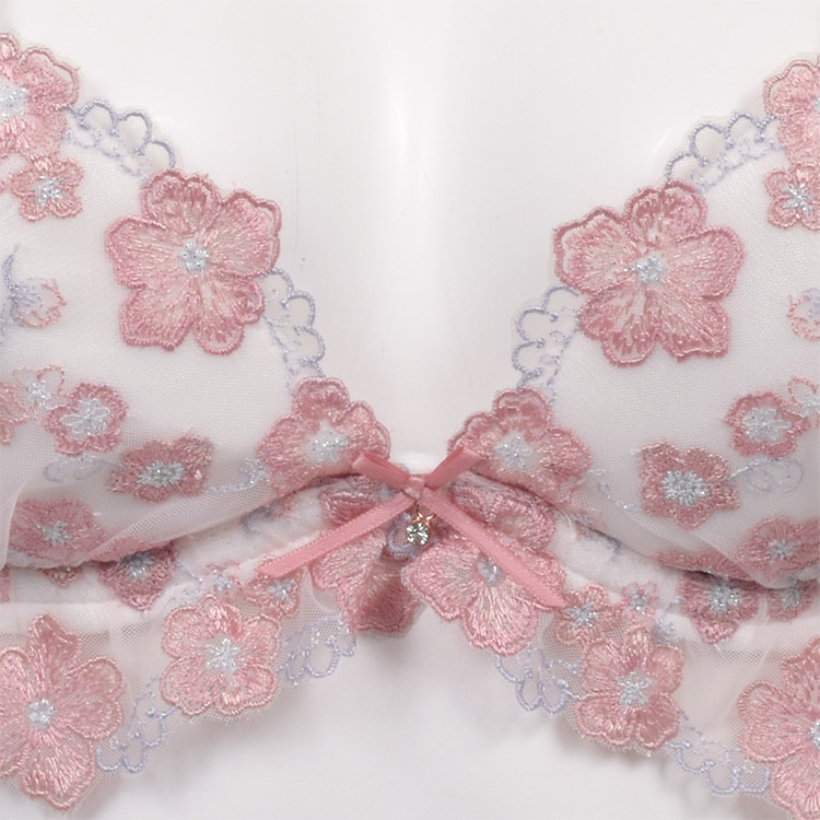 心弾むような生き生きとした桜の花がポイント。カップ下を飾るチュールレースフリルが可愛らしい雰囲気。