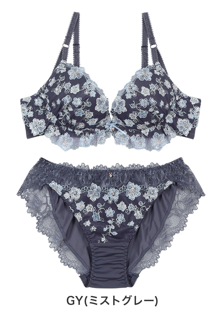 - カップ表は4色の糸を使った贅沢なチュールレースがカップ全体に咲くデザイン。