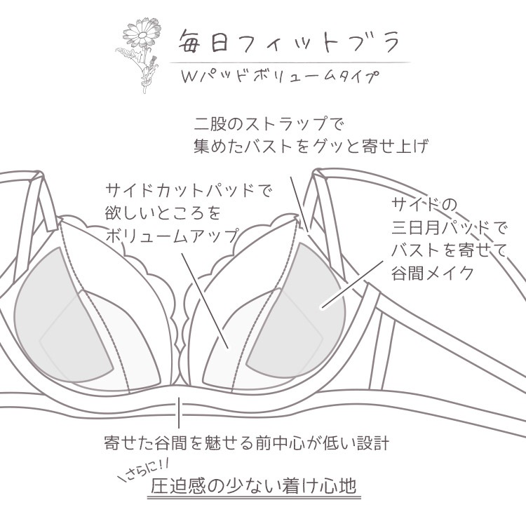 L字ワイヤーがサイドからバストを寄せて谷間をキレイにメイク。