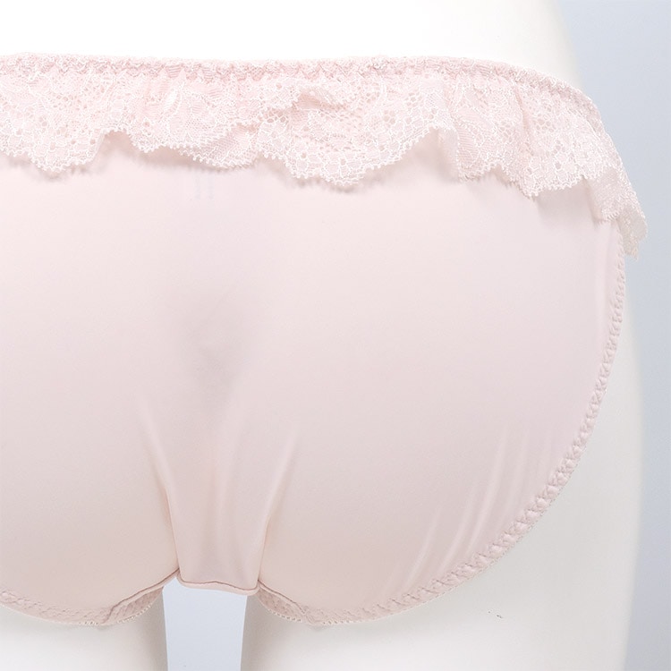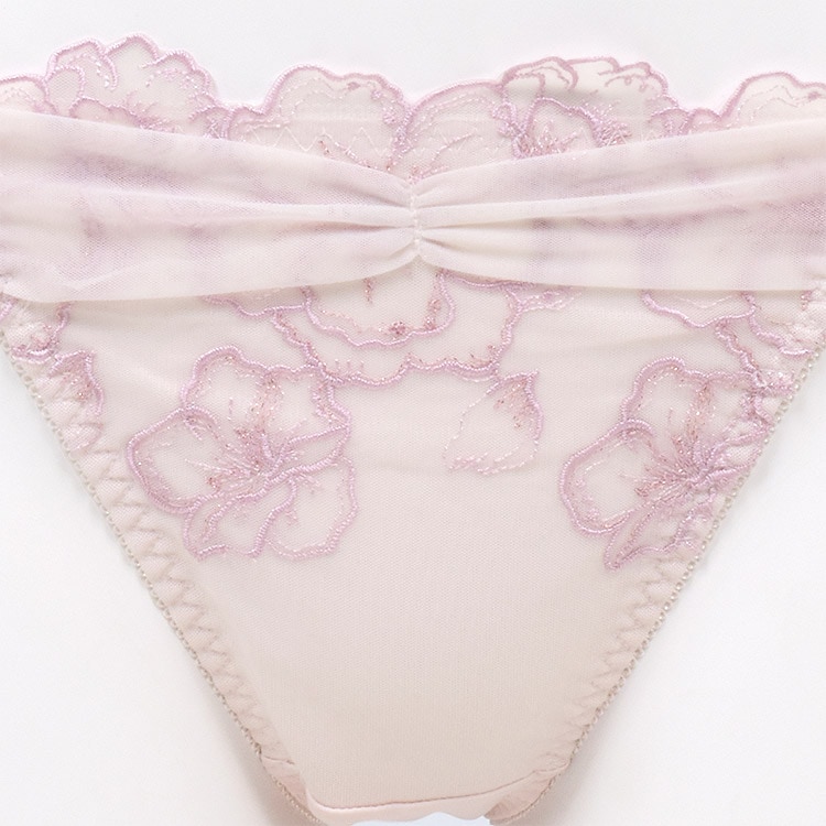 - カップにはラメ糸を使用した透け感のある大花刺繍レースを使用。サイドにあしらったドレープが優しくバストを引き上げ、シルエットを美しく演出。さらにアンダー部分のストレッチレースフリルが可憐さを添え、どこか儚さを感じさせるデザイン。