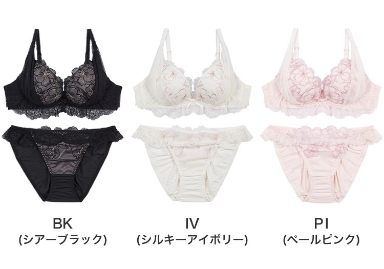 Eカップ(E60・E65・E70・E75)カラー BK(シアーブラック)、IV(シルキーアイボリー)、PI(ペールピンク) 素材 <ブラ>ナイロン、ポリエステル、その他