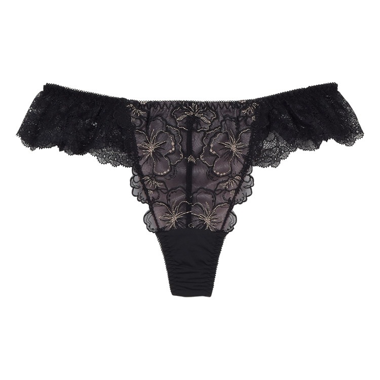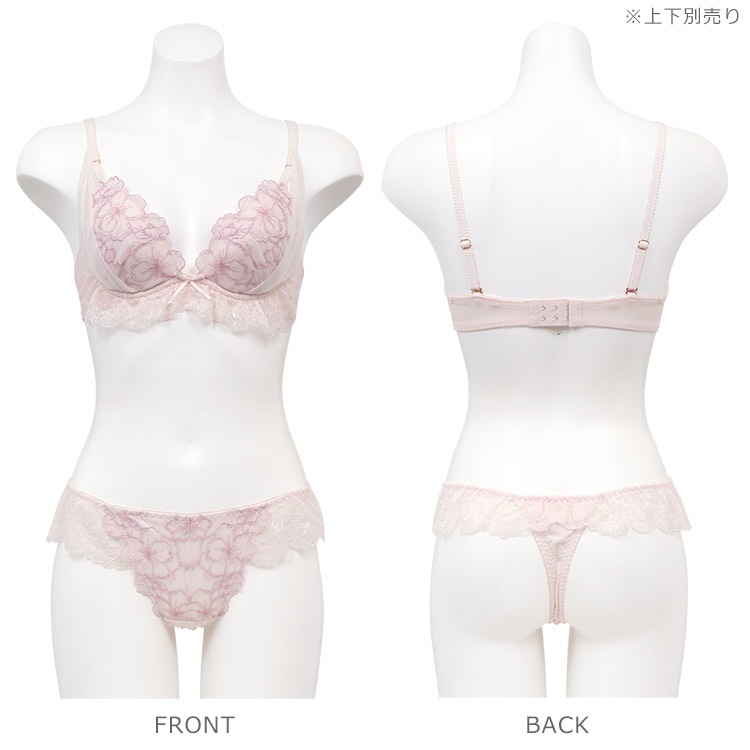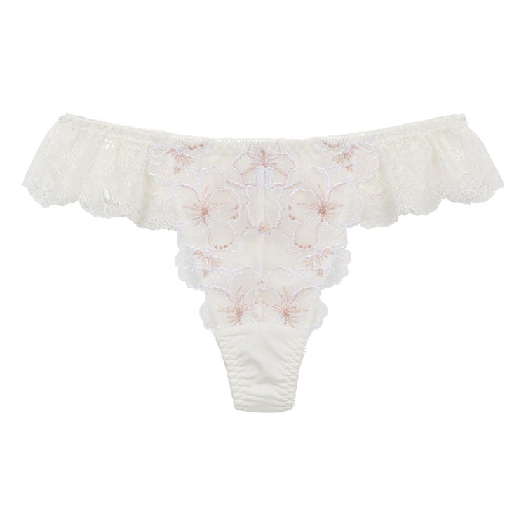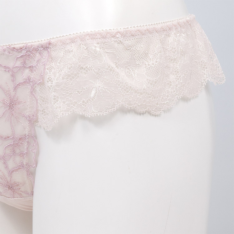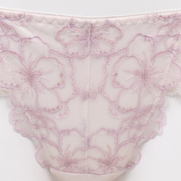 - フロントは花柄チュールレースの花びらが付け根に寄り添い、脚を美しく魅せるデザイン。